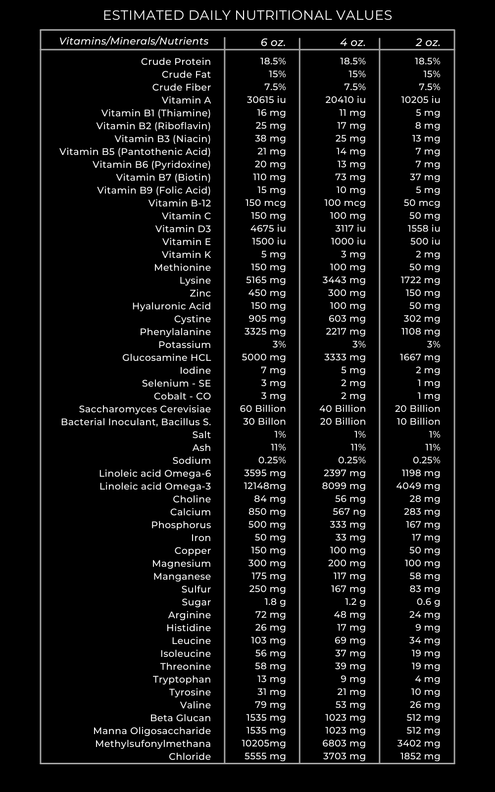 Know exactly what your feeding EVERYDAY with EES's Estimated Daily Nutritional Values Chart.